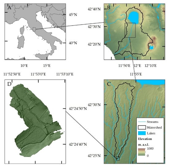 (A) Location of the Marta river basin in Central Italy. (B) Map of the Marta River Basin. (C) Watershed of the Maschiolo small tributary of the Marta river. (D) Map of the study area, showing the shades of the LiDAR DEM. The legend in panel C is also related to panels B and D.