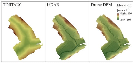 TINITALY, LiDAR, and Drone-DEM elevations models for the study area.