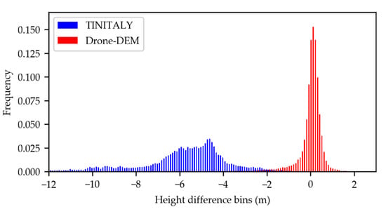 Distributions of the height differences of the TINITALY and Drone-DEM with respect to the LiDAR.