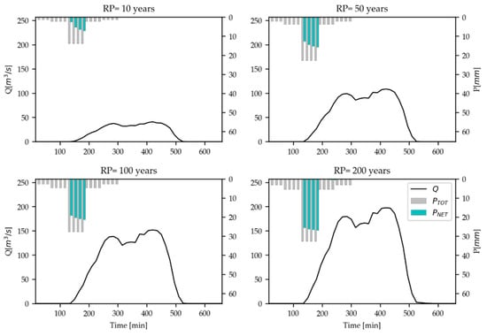 Gross Chicago hyetographs (PTOT) and excess rainfall hyetographs (PNET) (upper x-axis), and design hydrograph (Q-lower x-axis) for the selected return times (10, 50, 100, and 200 years).