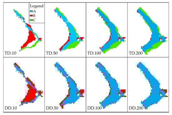 Maps of matching: A, overpredicted: B, and underpredicted: C; areas of simulations from TINITALY (TD-upper panels) and Drone-DEM (DD-lower panels) for the selected return periods–10, 50, 100, and 200 years (left to right panels).