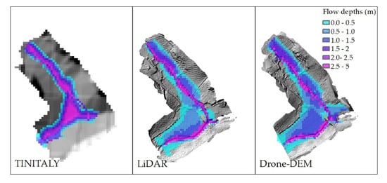 Maximum asynchronous flow depths of the simulations from TINITALY, LiDAR, and Drone-DEM (200 years return period).