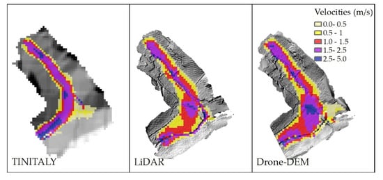 Maximum asynchronous flow velocities of the simulations from TINITALY, LiDAR, and Drone-derived DEMs (200 years return period).
