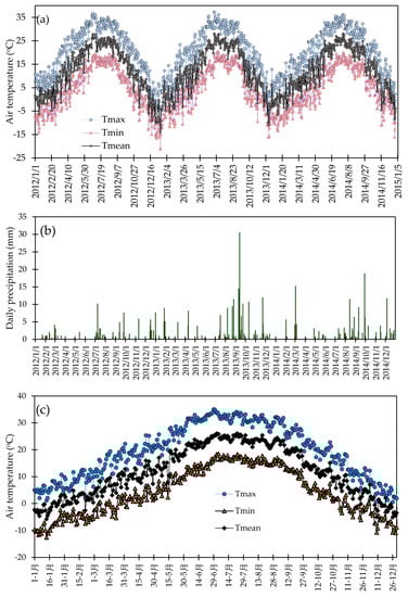 Evolution of the (a) daily maximum (Tmax), minimum (Tmin), and mean (Tmean) air temperatures, (b) precipitation during the 2012–2014 period, and (c) the 2012–2014 average daily maximum, minimum, and mean air temperatures, and daily precipitation.