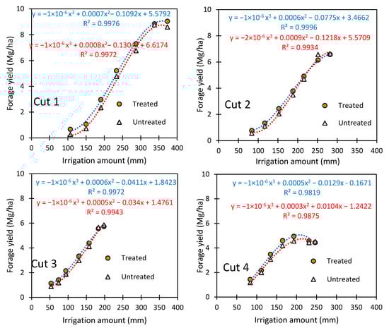 During the 2013 and 2014 growing seasons, alfalfa forage yield showed a third order polynomial relationship with the applied irrigation amount with the coefficient of correlation greater than 0.93 during each regrowth cycle (Figure 2 and Figure 3). Fungicide application showed non-significant effect on forage yield in 2013 and 2014 (Table 1; p = 0.6307). Forage yield at the first cut in 2013 was similar for all treatments as the same irrigation amount was applied to all treatments for better crop establishment. The maximum amount of applied water was 350, 300, 208, and 312 mm during the first, second, third, and fourth regrowth cycles in 2013, respectively (Figure 2). The greatest total irrigation amounts applied in 2014 were 374, 282, 198, and 246 mm for the respective regrowth cycles. Alfalfa forage yield significantly decreased from the first cut to the fourth cut. Maximum forage yield of 7.5 Mg/ha was obtained under the irrigation amount of 279.4 mm and yield decreased at high irrigation amount during the second cut in 2013 while forage yield plateaued at irrigation amount of 190.5 and 208.3 mm during the third regrowth period. During the fourth regrowth period, forage yield increased with the applied irrigation. The maximum yield was obtained at 241.3 mm and the yield decreased significantly thereafter with increasing irrigation amount (Table 1) (Figure 2). Forage yield averaged 7.8, 4.6, 3.4, and 3.9 Mg/ha for the treated alfalfa and 8.1, 5.0, 3.6, and 3.5 Mg/ha for the untreated alfalfa for the first, second, third, and fourth cuts in 2013, respectively. The maximum applied irrigation amounts were 373.4, 282, 198, and 246.4 mm during the first, second, third, and fourth regrowth cycles, respectively, in 2014. The highest forage yield was obtained under the highest irrigation except for the last regrowth cycle where the maximum forage yield was obtained at the applied irrigation amount of 193 mm. The maximum forage yield was 9.0, 6.6, 5.7, and 4.5 Mg/ha under fungicide treatment and 8.6, 6.6, 5.9, and 4.5 Mg/ha under non-fungicide treatment during the first, second, third, and fourth cuts in 2014, respectively. These results are in contrast to Nutter et al. [44] who reported significant forage yield loss of 19.2% due to fungal diseases across Iowa, Ohio, Vermont, and Wisconsin from 1995 to 1998. Alfalfa forage yield increase of 7.4% was associated with the fungicide Mancozeb in Kansas [53] while in Arizona, Matheron and Matejka [54] reported alfalfa yield increased within the range of 7.5–13.0% with chlorothalonil application. The difference in the research results might have been influenced by the difference in the climatic conditions between the humid region and semiarid to arid region of northwest New Mexico. While fungal diseases are present in the study area, based on classic climatic comparisons, the emergence and severity of the pressure and impact of these diseases in a semiarid area are non-significant and sometimes completely unexpected [55,56,57,58]. In fact, the low relative humidity and high air temperature are non-favorable conditions for the development and spread of the fungal diseases in the desert area.