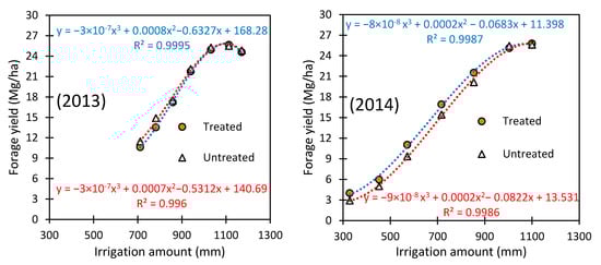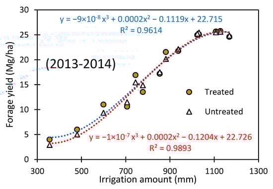 Alfalfa total annual forage also showed a third order polynomial relationship with the seasonal irrigation amount in the 2013 and 2014 (Figure 4). Seasonal applied irrigation amount varied from 711 to 1171 mm in 2013 and from 328 to 1100 mm in 2014. The lower limit of applied irrigation amount in 2013 was greater than the lower limit in 2014 due to uniform irrigation amount application during the first regrowth period in 2013 for better crop establishment. Similar to each regrowth cycle, there was no significant difference between the treated and untreated alfalfa forage yields (Table 1; p ≥ 0.05). Annual forage varied from 10.6 to 25.7 Mg/ha for the treated alfalfa and from 11.5 to 25.6 Mg/ha for the untreated alfalfa in 2013 while it varied from 4 to 25.8 Mg/ha for the treated alfalfa and from 2.9 to 25.6 Mg/ha for the untreated alfalfa during the 2014 crop growing season. In 2013, seasonal forage yield significantly increased with irrigation amount up to 1112.5 mm and decreased at the seasonal applied irrigation amount of 1171 mm. In 2014, alfalfa seasonal forage yield also increased significantly with the applied irrigation amount and the applied irrigation amount of 1003.3 and 1100 mm obtained non-significantly different yields (Figure 4). The 2013 and 2014 data pooled together showed a significantly increasing trend in alfalfa forage yield with the applied irrigation amount and the yield plateaued with 24.5 Mg/ha at the applied irrigation rate of 1031 mm and thereafter. The curve of developed alfalfa response to irrigation could be used by alfalfa hay producers for decision making with regard to the seasonal available water for planning and in-season water management.