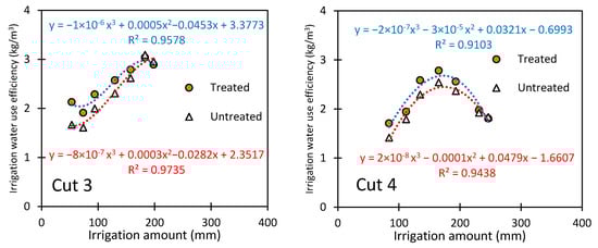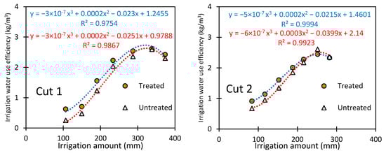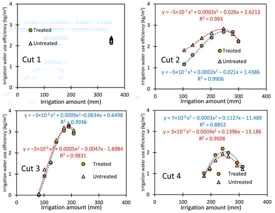 Irrigation water use efficiency of alfalfa as function of irrigation amount at each cut during the 2014 growing season.