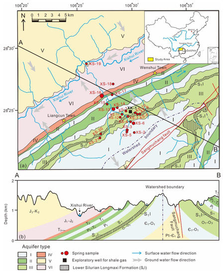 Study area. (a) The planimetric map with the distribution of aquifers; (b) the section map of aquifers. The introduction of aquifer types can be found in the text. The bigger dots indicate the spring water samples with higher discharges, while the Lower Silurian Longmaxi Formation (S1l) is the target stratum for shale gas exploration.
