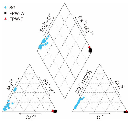 The Piper diagram of shallow groundwater (SG) of the Xishui region, flowback and produced water from Weiyuan (FPW-W) and Fuling (FPW-F).