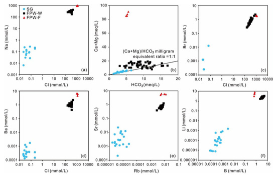 (a) Relationship between Na and Cl; (b) relationship between Ca + Mg and HCO3; (c) relationship between Br and Cl; (d) relationship between Ba and Cl; (e) relationship between Sr and Rb; (f) relationship between Li and B.