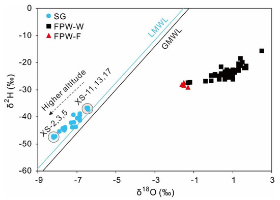 The plot of δ18O-H2O and δ2H-H2O of shallow groundwater from Xishui, FPW-W, and FPW-F. GMWL (global meteoric water line): δ2H = 8δ18O + 10 [71]; LMWL (local meteoric water line) for Zunyi: δ2H = 7.89δ18O + 11.95 [72].