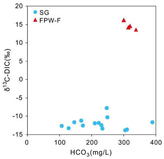 The diagram of δ13C-DIC vs. HCO3 for shallow groundwater and FPW-F.