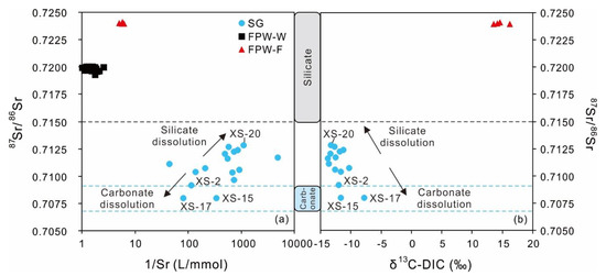 The diagrams of 87Sr/86Sr vs. 1/Sr (a) and 87Sr/86Sr vs. δ13C-DIC (b) for shallow groundwater, FPW-W, and FPW-F. The 87Sr/86Sr values from the weathering of silicate rocks were higher than 0.7150 [84,85,86]. The ratios of 87Sr/86Sr of carbonate rocks were in a range between 0.7068 and 0.7091 [83].