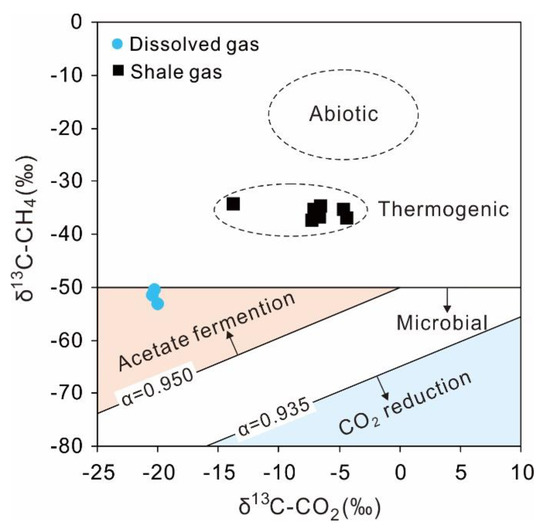 The plot of δ13C-CH4 versus δ13C-CO2 with the dissolved gas of shallow groundwater in Xishui and shale gas from Weiyuan. The abiotic range is from Ueno et al. (2006) [104] The lines of α = 0.935 and α = 0.950 stand for the boundary line of CO2 reduction and acetate fermentation, respectively [70].