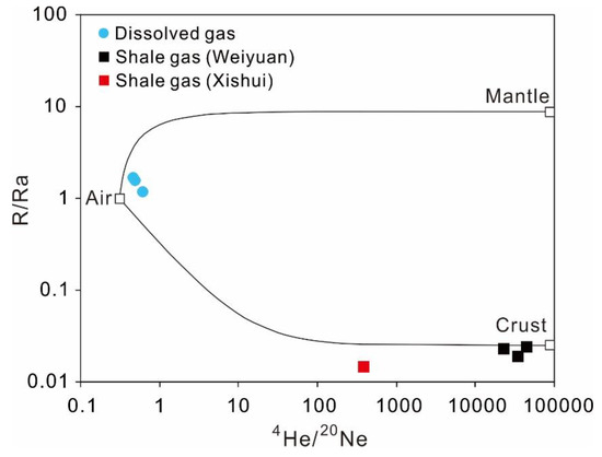Diagram of R/Ra versus 4He/20Ne with dissolved gas in shallow groundwater and shale gas from Weiyuan and Xishui.