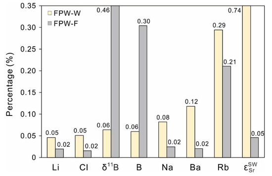Although the spring water samples were collected in the wet season (June 2018), the little temporary variability of geochemical and isotopic compositions of springs as groundwater in the study area has limited impact on the changes of threshold values of specific indicators. Springs in the study area represents the average chemical and isotopic compositions of rainfall in the past several months to several years [53] and the seasonal variation has been homogenized. According to the geochemical and isotopic data of spring water collected in Jiaoshiba, Chongqing with similar hydrogeological conditions [43], the major ions (Na, Cl), trace elements (B, Li,) and isotopes (δ13C-DIC) of springs had no significant variation between the dry season and the wet season. Besides, the geochemical (Na, Cl, B, Li, Ba, Sr) and isotopic compositions (87Sr/86Sr, δ13C-DIC) of a spring (unpublished data), collected in Xishui region in March, 2019 (dry season), were in the range of spring water samples (wet season) in this study. Assuming that the contents of major ions and trace elements of 21 spring water samples in the dry season would be abnormally three times higher than that in wet season (87Sr/86Sr and δ11B are assumed to be stable), the threshold values of sensitive indicators used for identifying the mixing of FPW-W and shallow groundwater (including the dry and the wet season) would remain low, such as Na (0.21%), Cl (0.13%), B (0.14%), Li (0.11%), and δ11B (0.13%). Although the δ11B of most spring water samples are undetectable due to extremely low boron concentrations, the contaminated groundwater mixed with FPW would be likely qualified to be measured for δ11B. For example, when 0.06% of FPW-W (threshold value) mingles with 99.94% of shallow groundwater, the boron concentration of polluted groundwater would be 30.6 μg/L, which can be totally qualified to the δ11B measurement in the laboratory. Meanwhile, a spring, polluted by FPW in Jiaoshiba, had a high boron concentration of 60.3–69.0 μg/L and could be measured for δ11B [43]. Therefore, if the pollution of FPW occurs, the polluted spring will be likely eligible to the δ11B detection and the δ11B can be used to verify the contamination of FPW.
