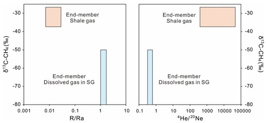 The 3He/4He ratio in the atmosphere (Ra) is around 1.39 × 10−6 [109,110], while 4He/20Ne of the atmosphere can be 0.318 [107]. The 3He/4He ratios in other geological systems are usually expressed by R. The R/Ra ratio in the mantle, commonly represented by mid-oceanic ridge basalts (MORB), has an average value of 8.75 [111]. The typical R/Ra ratio of the crust is approximately 0.025 [112]. According to the different isotopic values of noble gas in the air, mantle and crust, the plot of R/Ra versus 4He/20Ne can be applied for tracing the origin of gas, with the three end-members including air (R/Ra = 1, 4He/20Ne = 0.318), mantle (R/Ra = 8.75, 4He/20Ne = 100,000), and crust (R/Ra = 0.025, 4He/20Ne = 100,000) (Figure 9). Although the 4He/20Ne ratio of 100,000 is the assumed value for mantle and crust, the extremely high 4He/20Ne can occur in the natural gas from several gas fields, such as the Hugoton-Panhandle gas field in the USA (up to 46,000) [113] and gas wells in Polish and Ukrainian Carpathians (up to 41,200) [114].