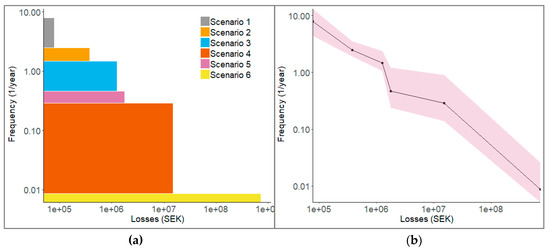 where is the total annual risk, N is the total number of analyzed scenarios, x is the combined economic consequences for the municipality, households and businesses (i.e., ), and F is the cumulative frequency as a function of consequence x. For risk estimation, the continuous function is simplified by the staircase function.