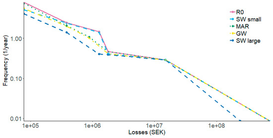 The risk curves of the alternative risk reduction measures are shown in Figure 3 along with the risk curve of the reference alternative. The potential risk reduction of the measures is the difference between the risk curve of the reference alternative and those of the measures. The large-scale surface water measure was shown to reduce the total annual risk the most, suggesting a potential reduction of approximately 6 million SEK annually compared to 965,000 SEK for groundwater, 785,000 SEK for MAR, and 307,000 SEK for the small surface water measure (mean values).
