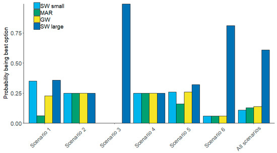The probabilities of each measure being the best option with respect to risk reduction for each individual scenario and combined for all scenarios is shown in Figure 4. The results show that the large-scale surface water measure has the highest probability to be the best option for most individual scenarios and for all scenarios combined. The ranking order of the other measures vary between risk scenarios.