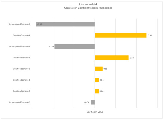 Figure 6 shows the degree to which input variables co-vary with the calculated total risk, expressed using Spearman rank correlation coefficients between −1 and 1. Input variables related to the return periods and duration of the risk scenarios contributed more to the outcome uncertainty than input parameters related to the economic consequences of the scenarios. This holds true also when comparing how the input variables co-vary with the estimated NPVs, i.e., input variables related to return periods and duration of risk scenarios contributed most to the NPV uncertainties.