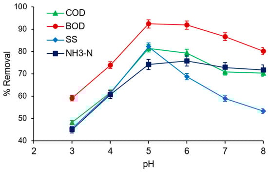 Influence of pH on the removal of COD, BOD, SS, and NH3 from SRPE using FeSO4·7H2O as a coagulant. Doses 1 g/L, coagulation time of 60 min, and sedimentation time of 60 min.