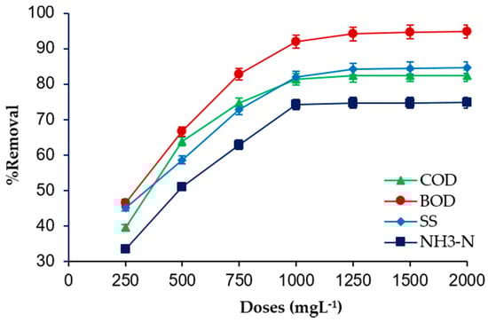 The removal of COD, BOD, SS, and NH3 from SRPE with varying FeSO4·7H2O waste doses was determined, as illustrated in Figure 2. When 250 mg/L of dosage was applied, the lowest coagulation efficiency was achieved for the removal of COD, BOD, SS, and NH3. Therefore, it required higher doses to deal with the high content intractable organic matter present in the SPRE. It was observed that the coagulation efficiency increased with increasing coagulant doses up to 1 g/L, thereafter the FeSO4·7H2O coagulation efficiency declined with increasing doses. At the optimal FeSO4·7H2O doses (1 g/L), the removal of COD, BOD, SS, and NH3 were 81%, 92%, 82%, and 74%, respectively. The increase of the coagulation efficiency with increasing coagulation doses was obtained probably due to the increase of positive charged metal ions concentrations to neutralize negative charge organic particles [27]. Ahead of the optimal coagulant doses, the reversal charge took place on the surface of the coagulant particles with the excess amount coagulant doses, and hence the decline of the increase of coagulation efficiency. A similar observation has been obtained by Zahrim et al. [27] and Hossain et al. [10], during decolorization of highly polluted palm oil mill biogas plant effluent using ferric chloride as a sole coagulant, and treatment of raw palm oil mill effluent using FeSO4·7H2O waste as a coagulant, respectively.
