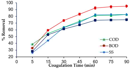The treatment time plays an important role by increasing the coagulant efficiency for the removal of organic pollutants from wastewater. The influence of the coagulation efficiency on the removal of COD, BOD, SS, and NH3 from SRPE using FeSO4·7H2O waste was determined, as presented in Figure 3. From the result obtained, it was observed that the removal of COD, BOD, SS, and NH3 increased with time, up to 60 min; thereafter the coagulation efficiency for the removal of COD, BOD, SS, and NH3 was found negligible. At the 5 min treatment time, the removal efficiency obtained for COD, BOD, SS, and NH3 was 39%, 33%, 26%, and 28%, respectively. The removal efficiency increased to 81%, 92%, 82%, and 74%, respectively, at the 60 min treatment time. The maximum removal obtained for COD, BOD, SS, and NH3 from SRPE using FeSO4·7H2O waste as a coagulant were 82%, 95%, 83%, and 75%, respectively, at 70 min coagulation time for a coagulant dose of 1 g/L, pH 5.0, and sedimentation time of 60 min. The negligible increase in the FeSO4·7H2O coagulation efficiency for the removal of COD, BOD, SS, and NH3 from SRPE which were observed over the 60 min treatment time could be due to the saturation of Fe(OH)3 with the colloidal organic pollutant over the 60 min treatment time. The coagulation time is crucial for the floc formation. After rapid mixing, the organic particles and coagulant particles require times to induce and make contact for progressively forming larger agglomerates to settling down [24]. At a shorter mixing time, the poor performance of the FeSO4·7H2O waste as a coagulant on the COD, BOD, SS, and NH3 removal was observed due to the low collisions between coagulant and suspended particles which led to lower floc formation for sedimentation [8].