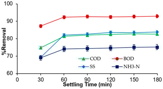 Influence of sedimentation time on the removal of COD, BOD, SS, and NH3 from SRPE using FeSO4·7H2O as a coagulant. pH 5, doses 1 g/L, and coagulation time 60 min.