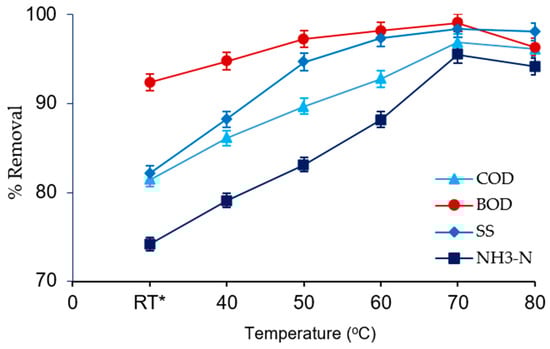 The removal of COD, BOD, SS, and NH3 from SRPE using FeSO4·7H2O waste was determined with varying temperatures from room temperature (28 ± 1 °C) to 80 °C, as presented in Figure 5. It was found that temperature potentially influences the coagulation efficiency of FeSO4·7H2O waste. At room temperature, the removal of COD, BOD, SS, and NH3 was found to be 81%, 92%, 82%, and 74%, respectively. The removal COD, BOD, SS, and NH3 rapidly increased with increasing temperature and reached maximum at 70 °C, however, the removal efficiency was decreased with a further increase of temperature above 70 °C. The maximum removal of COD (97%), BOD (99%), SS (98%), and NH3 (95%) were obtained at 70 °C. The increased coagulation efficiency with increasing temperature which was observed could be due to the reduction of viscosity with an enhancing dispersion rate of the organic particles towards the boundary line of FeSO4·7H2O waste. In addition, the kinetics energy of the iron (II) particles could increase with the elevated temperature, which enabled collisions with negatively charged organic particles in SPRE, and therefore increased the coagulation efficiency [10]. However, the decrease in adsorption efficiency with increasing temperature above 70 °C could be due to the weakening of the favorable intermolecular force between the coagulant particles+ and organic particles present in SPRE.
