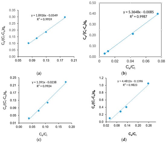 BET adsorption isotherm modeling for the removal of (a) COD; (b) BOD; (c) SS; and (d) NH3 from SRPE using FeSO4·7H2O as a coagulant.
