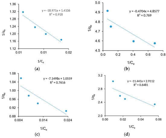 Langmuir adsorption isotherm modeling for the removal of (a) COD; (b) BOD; (c) SS; and (d) NH3 from SRPE using FeSO4·7H2O as a coagulant.