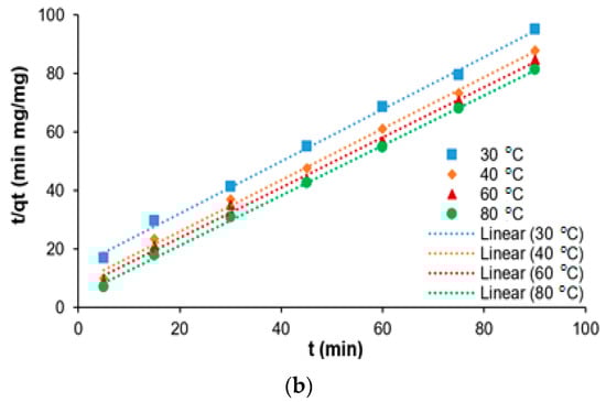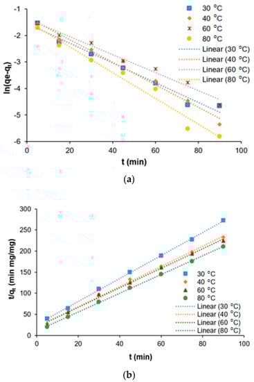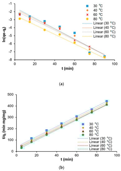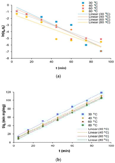 Adsorption kinetics studies for the removal of COD from SRPE using FeSO4·7H2O as a coagulant. (a) Pseudo-first-order kinetic model and (b) pseudo-second-order kinetic model.