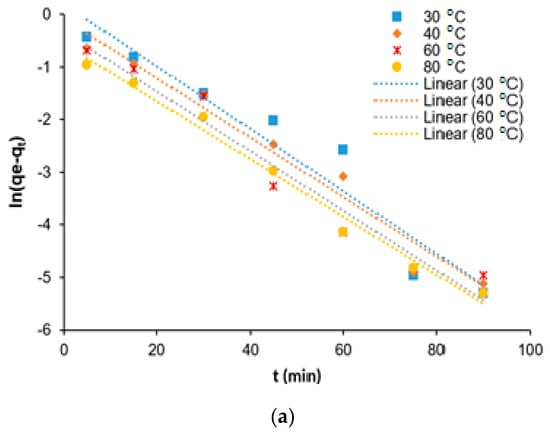 Adsorption kinetics has prime importance to elucidate the physical and chemical behavior of adsorbent (physisorption or chemisorption), as well as to determine the adsorbate uptake rate by adsorbent [7,24]. Pseudo-first-order and pseudo-second-order kinetic model equations were utilized to determine the kinetics mechanisms for the removal of COD, BOD, SS, and NH3 from SRPE using FeSO4·7H2O as a coagulant. The experiments were conducted at varying temperature (30 to 80 °C) as a function of the coagulation time (5 to 90 min) at pH 5, coagulant dose of 1 g/L, 60 min of coagulation time, and 60 min of sedimentation time. The pseudo-first-order kinetic model equation can be expressed as below [24]: