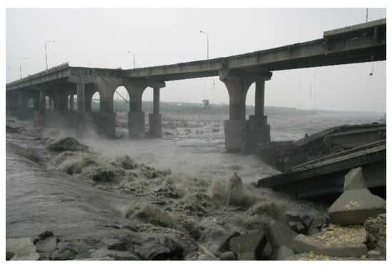 Failure of Houfeng Bridge in Dajia River, Taiwan due to pier-scour in September 2008 (courtesy of Yee-Meng Chiew).
