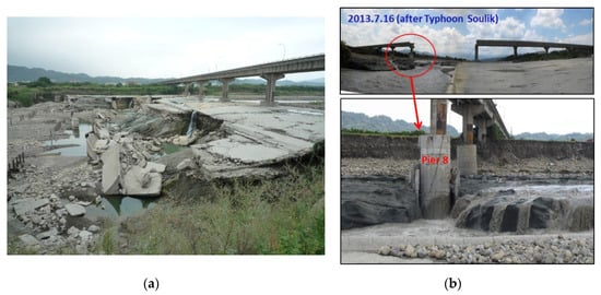 Scour downstream of grade-control structure leading to failure of Zhongzheng Bridge in Touqian River, Taiwan (a) scour downstream of grade-control structure in 2009 (courtesy of Yee-Meng Chiew); (b) Scour leading to bridge failure in 2013 (courtesy of Dr. Hong JH).