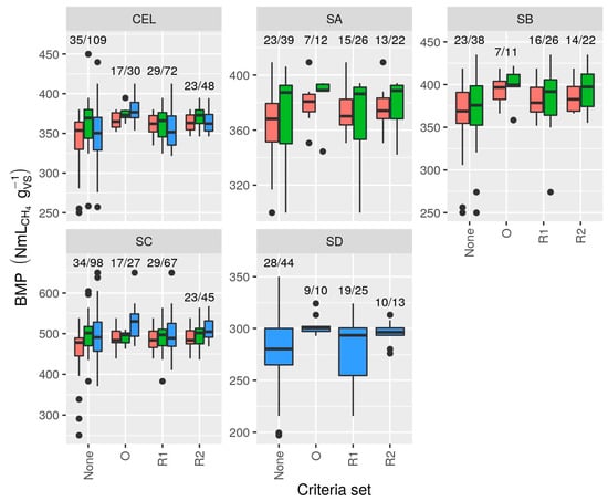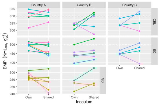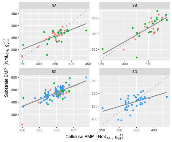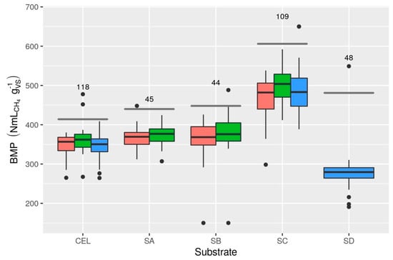 Reported BMP values showed low to moderate inter-laboratory variability: RSDR ranged from under 8% up to 24% depending on substrate and test (Table 3, Figure 1). Estimates of sources of random error from mixed-effects models were 3.6% for tests and 5.3% (standard deviation) for laboratories (intra- and inter-laboratory reproducibility, respectively) after exclusion of extreme values (12 observations were eliminated from subset B based on residuals) (Table S8). Apparent degradability was high for all substrates except SD (wheat straw), presumably due to its lignocellulosic composition. The overall mean CEL BMP was 346 NmLCH4 gVS−1 (S1 T1 and S2) to 365 NmLCH4 gVS−1 (S1 T2), implying that many values were below the validation limit proposed by Holliger et al. [] of 352 NmLCH4 gVS−1 (see Section 3.4.1).