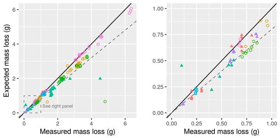 For comparisons between data subsets (Section 2.6.2), the nonparametric Wilcoxon test [] was used through the wilcox.test() function []. The same test was used to compare standard deviation among BMP measurements (calculated by country and substrate) from the inoculum comparisons included in subset G1. For evaluating apparent measurement bias based on a gravimetric check, a one-sample t-test on the relative difference was used [] with the t.test() function []. Correlation in BMP to CEL BMP was quantified using Kendall’s tau [], which is based on association in ranks and is not sensitive to outliers or deviation from a linear response. Robust regression was applied with the rlm() function to calculate the slope of the response [].