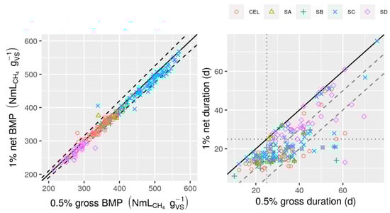 The primary unit of observation for data analysis was a BMP value for a particular substrate from a single test carried out by a single lab. Each BMP value was calculated from measurements made on 3 bottles with substrate and inoculum and 3 bottles with inoculum only (blanks). BMP was calculated using data on bottle contents (mass of inoculum, identity, and mass of substrate) along with cumulative CH4 production using the summBg() function, which follows the details given in Hafner et al. []. Several BMP durations were used for each substrate within each individual test including both fixed and relative durations. Four relative durations were considered, each defined by a response variable, a maximum relative rate, and a minimum measurement interval over which the maximum rate cannot be exceeded. The term “1% net 3 d duration” is used for the incubation duration when the daily net CH4 production (or average interval rate in NmLCH4 d−1 for those manual methods with sampling frequency < 1 d−1) dropped below 1% of cumulative net production for a continuous period of at least 3 consecutive days. Net CH4 production was calculated by subtracting the inoculum contribution from gross (total) CH4 production, as in calculation of SMP and BMP []. Other durations that were considered were: 1% gross 3 d, 0.5% gross 3 d, and 0.5% net 3 d. The 1% net 3 d duration was recommended by Holliger et al. [], and the more conservative 0.5% gross 3 d approach was recommended by VDI []. Durations were specified in the summBg() function using the “when” and “rate.crit” arguments. RSDB was calculated including contributions from three sources: substrate bottles, blanks, and substrate VS measurement [].