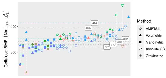 In general, variability was comparable to results from other studies. In the inter-laboratory comparison presented by Raposo [], RSDR was 15% for cellulose and as high as 37% for a simple proteinaceous substrate (gelatin). Similarly, Cresson et al. [] found RSDR of 13 to 21% for BMP of homogenous substrates measured in several French laboratories. In a 2017 German test summarized by Weinrich et al. [], RSDR was 8% for cellulose, but as high as 26% for other substrates, which included fresh maize silage, oat bran, and animal feed. Similarly, repeated German tests carried out for 9 years showed a cellulose RSDR between 7% and 13% (excluding nearly 20% for a single year), with similar values for maize silage [].