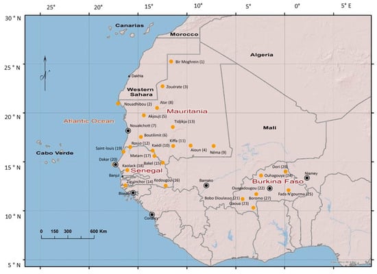The data were collected from the weather services in Senegal (ANACIM) (http://www.anacim.sn/meteorologie/), Mauritania (http://www.onm.mr/). Rainfall data from Burkina Faso were collected from the KNMI Climate Explorer (http://climexp.knmi.nl/selectstation.cgi?id=someone @somewhere). Some missing data were found on “TuTiempo.net” (https://fr.tutiempo.net/climat/afrique.html). This site uses the National Climatic Data Center’s Global Database (NCDC—https://www.ncdc.noaa.gov/data-access/quick-links).