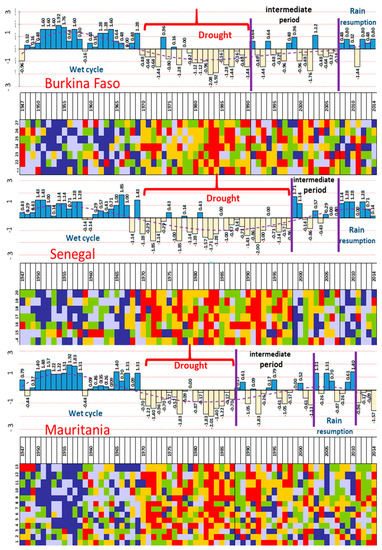 In the last period of the series studied, the trend is reversed again, and, as the ocean surface temperature increases, the indices of dry years decrease in favor of rainier periods. Thus, when quasi-decadal oscillations are positive and marked by a higher amplitude (warmer ocean), they correspond to a return of rains after Sahelian droughts and to an intensification of the West African monsoon rain cycle []. The graphical matrix (Figure 2) shows this return starting with 1990 in Burkina Faso, 1999-Senegal, and 2003-Mauritania. This explains the reverse connection with rainfall cycles in the studied regions.