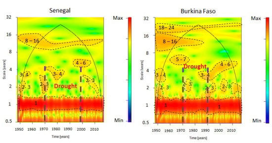 The CWT of the monthly data of precipitation was simulated (Figure 3). This analysis shows several variability scales for the two countries: Seasonal (6 months–1 year), interannual (2–3, 3–4, 4–6 and 5–7 years), quasi-decadal (QDO: 8–16), and multi-decadal (MDO: 18–24 only for Burkina Faso), as shown by Figure 3.