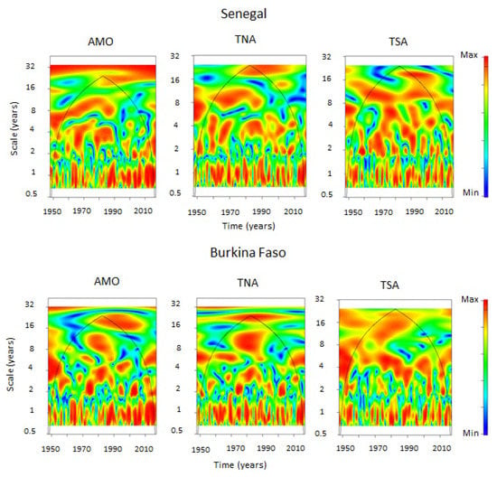 Wavelet coherence analysis between average monthly rain in Senegal and Burkina Faso (average of the different stations in each country) and climate indices: Atlantic multidecadal oscillation (AMO), Tropical Northern Atlantic Index (TNA), and Tropical Southern Atlantic Index (TSA).