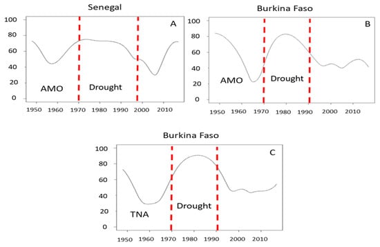 Mohino et al. [] show that the climatic drought of the 1970s and 1980s corresponded to a negative multi-decadal oscillation of the Atlantic, favorable to a low rise in the convergence zone over Africa, whereas the 1950s and rainy 1960s, like the recent small rainfall recovery in the years 1990–2000, corresponded to a multi-decennial Atlantic oscillation returning to the positive phase. When studying the general rain trend, we have already highlighted the short periods of rainfall variability in the regions studied. The cycle of climatic drought started from the year 1970. This period extended until 1998 in Senegal but did not exceed the beginning of the 1990s for Senegal (Figure 2). The search for the impact of the surface temperature of the Atlantic Ocean over this period is illustrated in the graphs presented for the two countries (Figure 5). The influence of AMO seems intensified over this period for the 8–16-year mode for Senegal and Burkina Faso (even if for this last country we mentioned a weak global relationship above). For the same mode, we also highlighted a strong link with TNA during the dry period of the latter country (Figure 5). For the other modes this connection sometimes appears to be time-shifted or not clearly established.