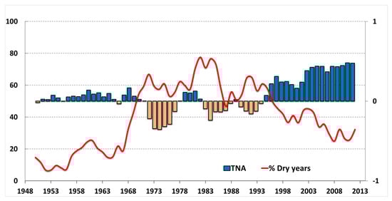 Evolution of dry years (%) and temperature of the Atlantic Ocean (TNA)—moving average over five years and the 1948–2014 interval; data source: https://www.esrl.noaa.gov/psd/data/correlation/tna.data.