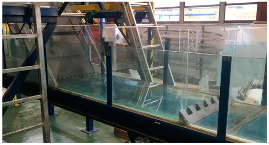 Regarding the energy dissipation devices, the chute blocks were installed in the connection between the sloping and the horizontal channel, whereas the end sill was placed 1.76 m downstream of these chute blocks (Figure 1). The energy dissipation devices were built with a 3D printing process in which a Prusa MK3 3D printer (Prusa Research, Prague, Czech Republic) by Prusa Research© was used. The material in which the pieces were printed was the thermoplastic known as Polylactic Acid (PLA), derived from renewable resources such as corn. Figure 2 shows a picture of the experimental device.