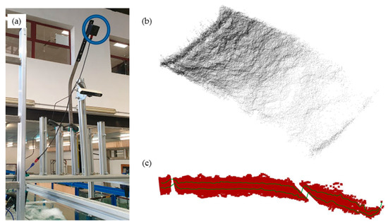 Light detection and ranging (LIDAR) techniques in the physical model (flow from right to left): (a) Time-of-flight camera placed in the experimental device; (b) point cloud obtained from the hydraulic jump free surface; (c) band containing 80% of the measured points.
