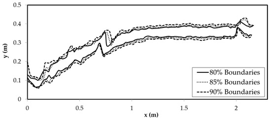 Regarding the hydraulic jump free surface, the first step was to process the data collected with the time-of-flight camera. To this end, anomalous values and outliers caused by splashing and droplets were discarded. This made it possible to obtain a series of bands containing a specific percentage of the measured points along the hydraulic jump longitudinal axis during the data collection time. Figure 5 shows the lower and upper boundaries for the bands containing 80%, 85% and 90% of the measured points.