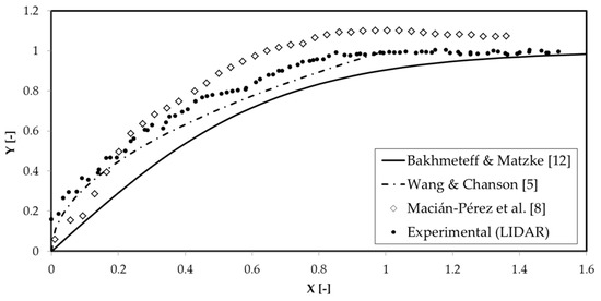 For the individual analysis of the complete profiles, in spite of the large number of points measured with the Pitot tube for each of them, the results provided a discrete and not a continuous velocity distribution. In addition, several tests conducted in the experimental channel, with the Pitot tube placed in a reverse position, showed that this device was not able to capture backwards velocities in the flow. A first attempt to overcome these issues was made by comparing the experimental data with the analytical expression for CHJ proposed by McCorquodale and Khalifa [18] (Figure 9). According to these authors, the mean vertical velocity distribution within the CHJ can be expressed through two functions: